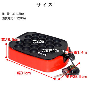 商品情報 サイズ 幅31×奥行き23.5×高さ8.5cmたこ焼き穴 数:22個直径:43π×深さ25mm材質 プレート:アルミダイキャスト(フッ素樹脂加工)本体:ポリプロピレン製品重量 約1.8kg消費電力 100V-1200Wコード長 1.4m温度調節 サーもスタット可変式生産国 日本その他・注意事項 商品画像は色合いや素材感が実際の商品と異なる場合がございます。